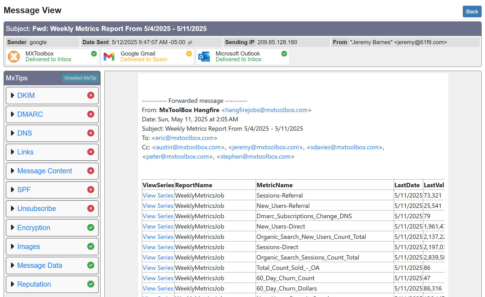 MxToolbox Inbox Placement analyzes key aspects of your email: the technical email header, content, images and links, etc. to determine if there are issues with the email that may prevent Google, Yahoo! or Outlook.com from placing the email in the recipients' inboxes. In addition, MxToolbox renders the full email to give you a visual view of where our MxTips are detect the potential for risky content!