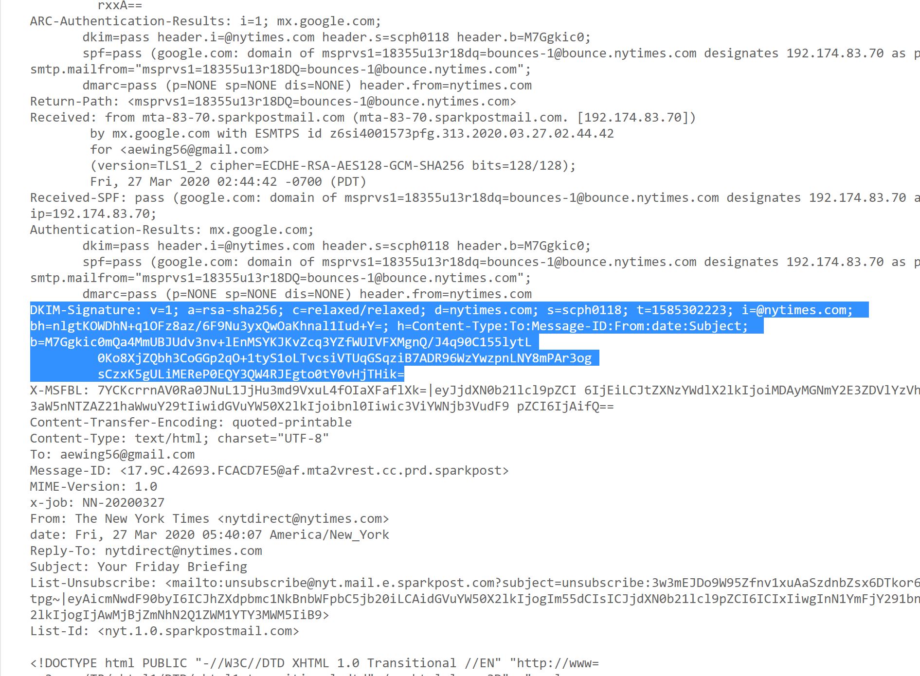 The DKIM-Signature header can be found by viewing the original headers of the email. For a quick guide explaining how to find/get email headers for popular mail providers, please check out our How to Find Email Headers page. Once you've accessed the original email header, look for a header named DKIM-Signature. (Note: There can be multiple DKIM-Signature headers in an individual email depending on the number of times an email has been forwarded or routed). This header will contain a list of tags, which is highlighted in the below image.